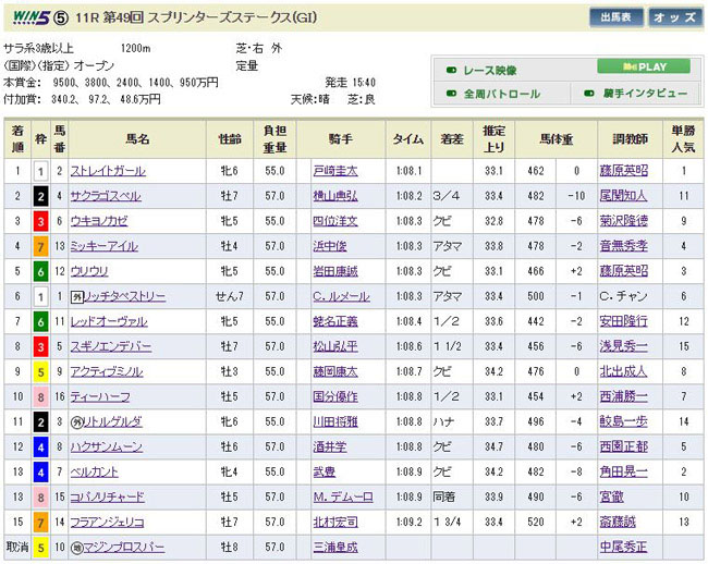 やはり人気通りには決まらないスプリンターズステークス!ロス無く立ちまわったストレイトガールが勝利するも、1分8秒1のスローな流れに差し馬は届かず、ウリウリは5着、レッドオーヴァルも7着まで・・・つーかGTで1番人気の戸崎が勝つとか、なかなか無い事ですw