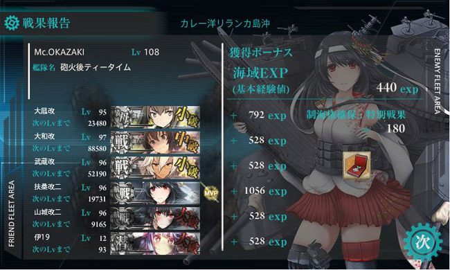 このレベルまで育ってくると、2-5ではまず道中撤退はありませんね。むしろ1戦目の後の羅針盤こそ、この編成最大の敵です・・・(今月は2回逸れました)。