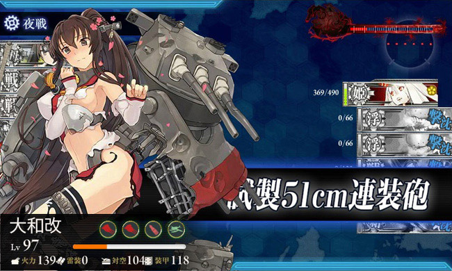 そして毎月の地獄である4-5。比較的苦労せずに突破出来た先月に反し、今月はラスダンでドツボにはまり、業を煮やして最後は大和&武蔵を投入。それでもボスを削り切れない事、数度・・・あぁ、資源が溶けて行く・・・