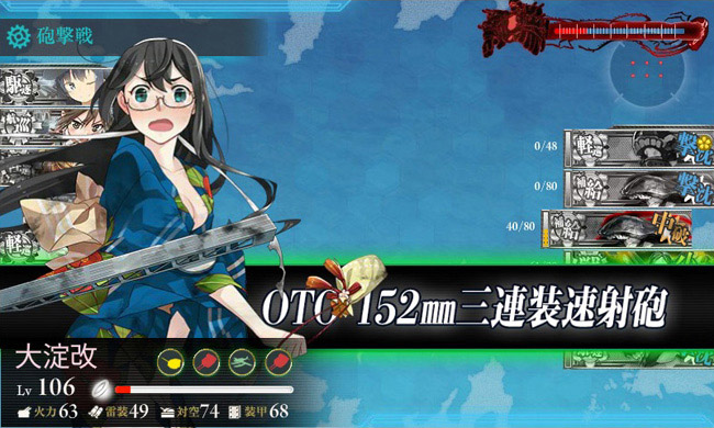 3-5はともかく駆逐艦がボス戦までに大破しないかが鍵なので、兵装は主砲+魚雷+缶で、回避90以上を目指しました。あと、3-5のために事前に出撃させる予定の駆逐艦にキラ付けしておくのも有効ですね。