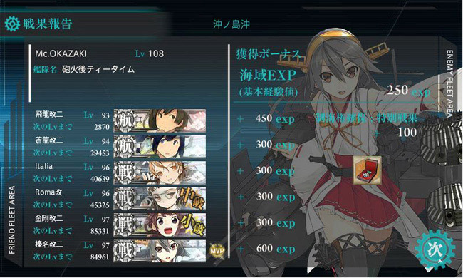 2-5は妙高型+最上+鈴谷で第5戦隊任務をこなした後は、いつもの金剛型+ニ航戦・・・ではちょっと芸が無いので、今月は比叡と霧島にお休みしてもらい、イタリアとローマを使ってみました。射程:超長は伊達じゃない!