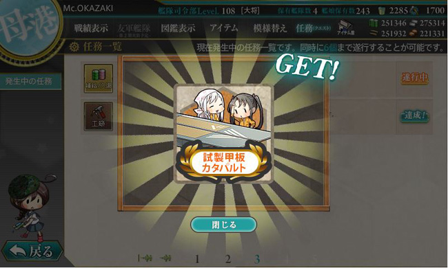 その前に、甲板カタパルトを求めて80時間の長ーい遠征に出ていた鳳翔おかんたちが無事帰還しました。この80時間任務、まさかまた受ける機会があるとは・・・。勿論全艦キラ付けで送り出し、貴重なボーキをたんまりと受け取りました。