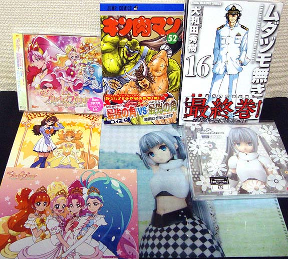 CDは『Go! プリンセスプリキュア』の後期EDと『ミス・モノクローム-The Animation- 2』OP&EDを含むミニアルバム。コミックは『キン肉マン』の52巻と『ムダヅモ無き改革』16巻(最終巻)です。