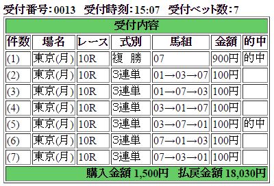 今日の府中10Rで、久しぶりに三連単147倍の万馬券がヒット!複勝も併せてようやくクリーンヒットを出せました。