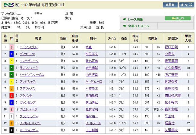 正直、ラブリーデイの強さだけが光ったレースで、本番(秋天)では他の馬はいらないかな・・・とも思えました。人気はエイシンヒカリと分け合う形になると思いますが、2000m戦ならラブリーデイの方に分があるんじゃないですかね?