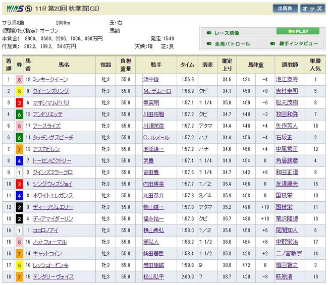 レースはノットフォーマルが逃げて1000m57秒台の超ハイペース。これにまともに付いて行ったレッツゴードンキは早々に潰れ、ミッキークイーンを筆頭にした追い込み勢有利の流れになったんですが、その流れで6着までだったのはルメールの乗りヘグリか、はたまた前走が上手く行き過ぎたのか・・・。タッチングスピーチへの評価はちょっと保留ですね。勝ったミッキークイーンはちゃんとスタートさえ出来れば強い事を証明出来たので、この後はエリザベス女王杯へ向かって、新・最強牝馬伝説を作って欲しいもんです。
