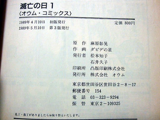 奥付。何気に3刷もされてる。発行者の松本知子は麻原の嫁、石井久子も著名な幹部ですよね。郵便番号が3桁、東京の電話番号が9桁というのも時代ですねぇ。