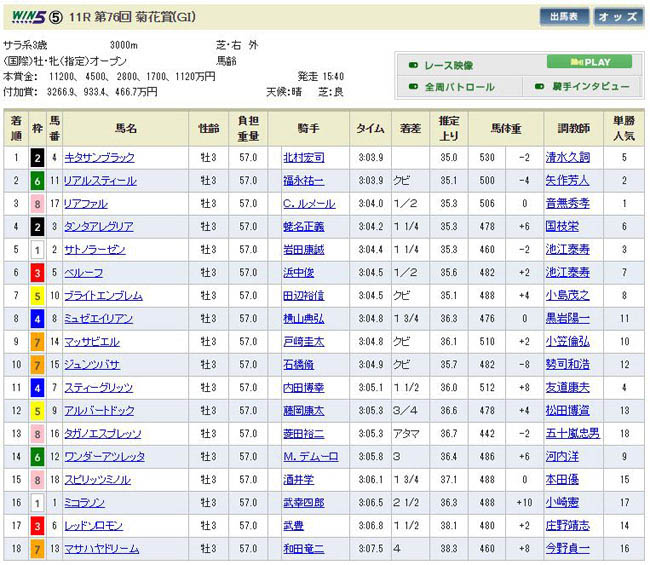 ハイ、お馴染み牡馬三冠ロードの最終章、菊花賞です。速い馬が勝つ皐月賞、運のある馬が勝つダービー、そして最も強い馬が勝つ菊花賞なんて昔は言われてましたが、近年は・・・たまーに「なんちゃってGT馬」を輩出してますよね。君のことだよ、ビッグウィーク!