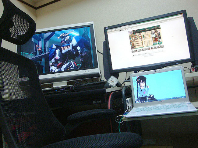 とりあえずPC周りの環境を構築・・・これまで別個配置だったPCとTVを並列にする事によって、双方の情報を同時に視野に入れる事が出来ます。また、PCチェアも新調。何しろ家では一番長く居る場所ですから(ベッドよりも!)、こだわりたいポイントです。