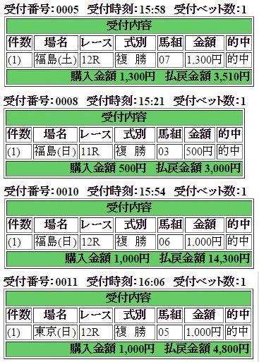 しかし!今週は不良馬場も相俟って、我が師匠anka2氏の穴逃げ馬予想がズバズバ的中!これに乗っかってローリスク・ハイリターンの人気薄の複勝を4つ獲れました(師は三連系も当てまくって●十万勝ってます。すげぇ!)。特に圧巻は日曜の福島最終の13番人気馬の勝利でしょうか。複勝でもこの破壊力ですよ!