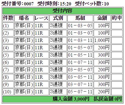 でも馬券は三連複5頭BOXで。相手には不良馬場のために逃げ残りが予想される9番人気のエーシンモアオバーと、京都or小倉コースで逃げ・先行馬に乗せると時々アッと言わせる太宰騎手が駆るアスカノロマン(8番人気)が絡んでくれるのを期待します。