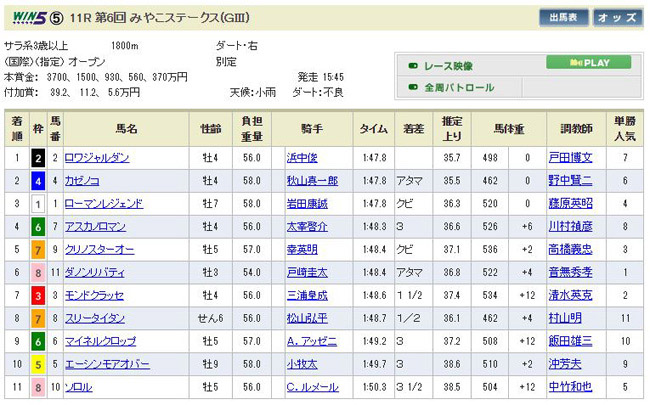 重賞初挑戦の伏兵・ロワジャルダンが大金星の勝利!2着には復活のジャパンDD馬カゼノコ。古豪ローマンレジェンドは3着、やはり平坦コースでは怖い太宰騎手のアスカノロマンが4着。ダノンリバティはまさかの6着敗退。うーん、これはさすがに獲れません・・・。