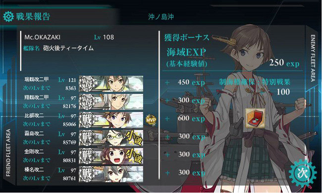 続いては2-5。最初に妙高・那智・足柄・羽黒と航巡2隻(今月は鈴谷と熊野)で第5戦隊任務をクリアした後は、正規空母2隻・高速戦艦4隻のパワー編成でいつものゴリ押し。