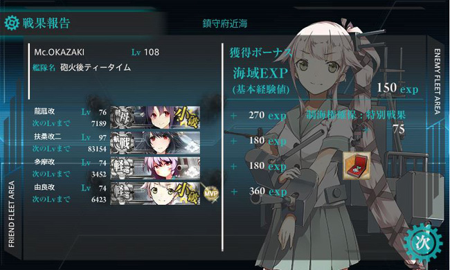 まずは1-5。軽空母(最近はほぼ龍鳳固定)+航空戦艦+軽巡2隻で回すいつもの編成でサクッと勲章1つ目。まぁここに関しては特筆すべき事もないですかね。