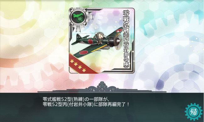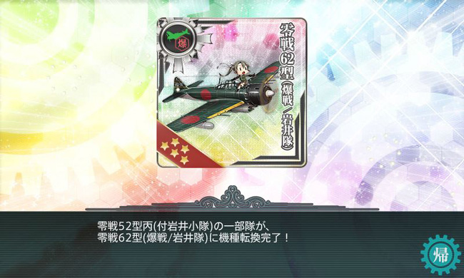 練度maxの零戦52型丙(付岩井小隊)を搭載した瑞鶴を秘書艦にし、零戦62型(爆戦)を2つ廃棄する事により(52型丙はここで消滅)、爆戦ルートの最終形態、零戦62型(爆戦/岩井隊)を入手!長かった機種転換任務の1つの到達点です。