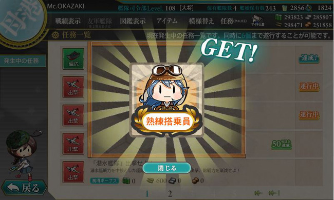 零戦52型甲(付岩本小隊)を入手した後、翔鶴改二+瑞鶴改二+駆逐艦2隻の艦隊を編成する事により、伊良湖の他に熟練搭乗員がもう1つ貰えます。これは来月以降の機種転換任務で使う事になるので、大事に保管です。