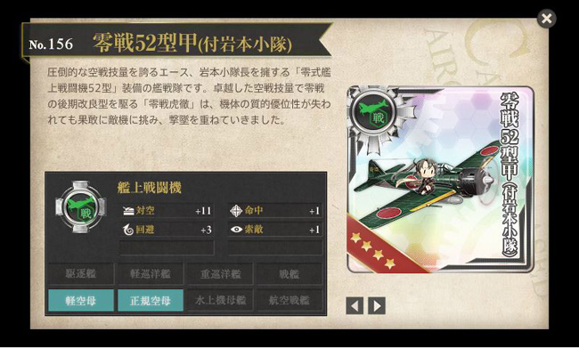 これまで鎮守府で最強の戦闘機だった烈風(601空)に比しても、対空+1、索敵+3、命中+1、回避+2と完全に上位互換。さすがは「零戦虎徹」岩本徹三の部隊です。艦戦の岩本隊、爆戦の岩井隊、艦爆の江草隊、艦攻の村田隊と友永隊・・・あぁ、彼らが活躍する秋イベが待ち遠しいです♪