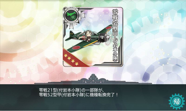 ようやく入手まで辿り着いた零戦21型(付岩本小隊)を演習とレベリングで練度maxまで育て、これを瑞鶴に搭載した上で秘書艦にし、零戦52型を2つ廃棄する事によって零戦52型甲(付岩本小隊)を入手出来ます。この機種転換によって零戦21型(付岩本小隊)は消滅しますが、完全なる上位機種へのステップアップなので惜しんではいられません。