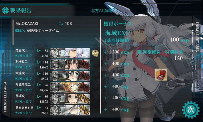出撃回数の多い海域なので、最後はカスダメや疲労の蓄積で一部のメンバーが交代されますが、バケツを使う程の事もなく今月も1-6突破。