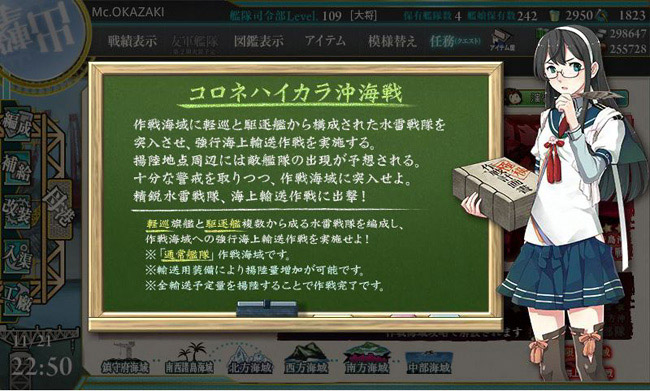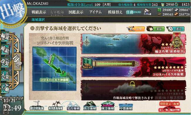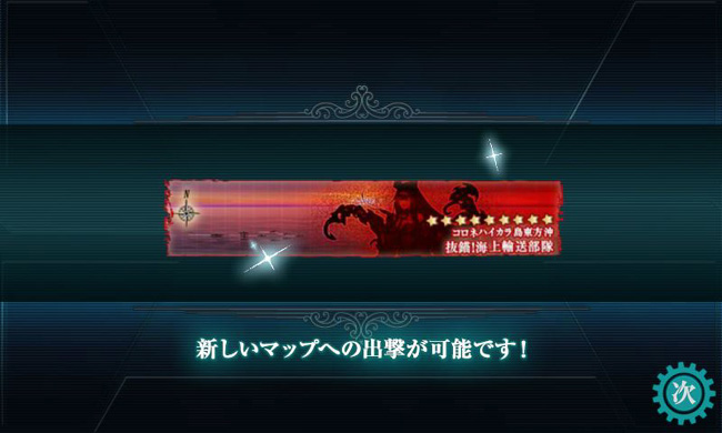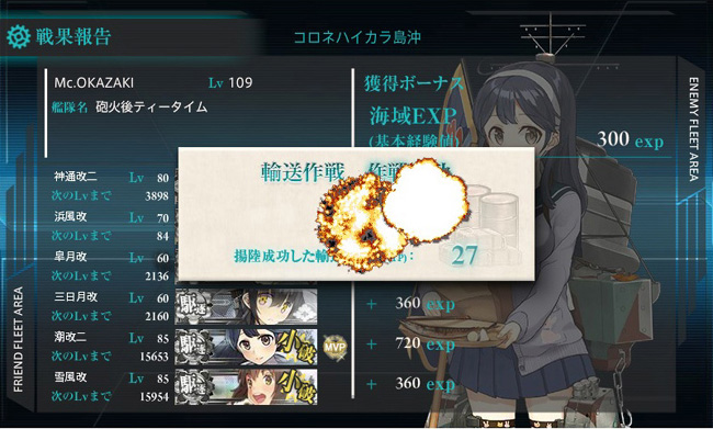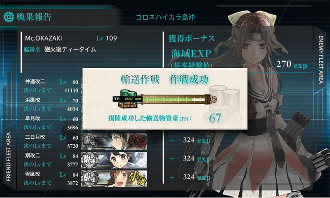 と言うのも今回の目的は輸送任務。輸送マスで揚陸を成功させ、ボスマスでA勝利以上を獲れば作戦は成功とみなされて輸送物資量ゲージがドラム缶や大発の数に応じて減るという・・・。なので、早くゲージを削りたければドラム缶を多く積めば良いものの、ボスとの戦いでA勝利が取れる兵装は必要という、そのバランスが重要になります。