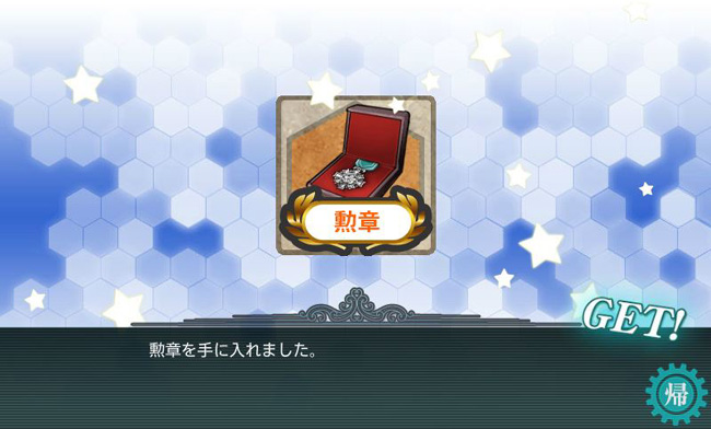 甲作戦による海域突破報酬は給糧艦間宮、応急修理女神、戦闘糧食x2、補強増設x2、そして勲章。報酬装備も報酬艦娘もない、しょっぱい海域です。