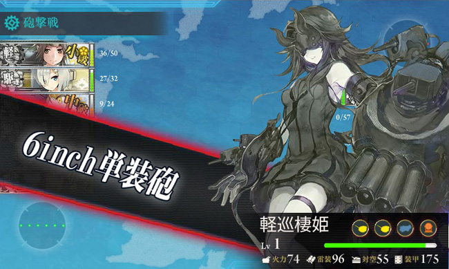 元が4本煙突の旧式軽巡とあって軽巡棲姫の攻撃は然程ではないものの、何しろこっちは非力な艦隊なので当たればまず中・大破は免れません。ここはいかに昼戦で避けまくるかですが、実はこのマップではボスを完全に倒す必要はなかったり・・・