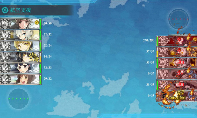 まずは航空支援をドーンと!瑞鶴・翔鶴・飛龍・蒼龍とただでさえ火力の高い空母に熟練maxネームド機ですから、黙ってても2隻以上は吹き飛ばしてくれます。こちらは皐月と三日月がほぼ戦力にならないので、この支援攻撃は必須と言えます。