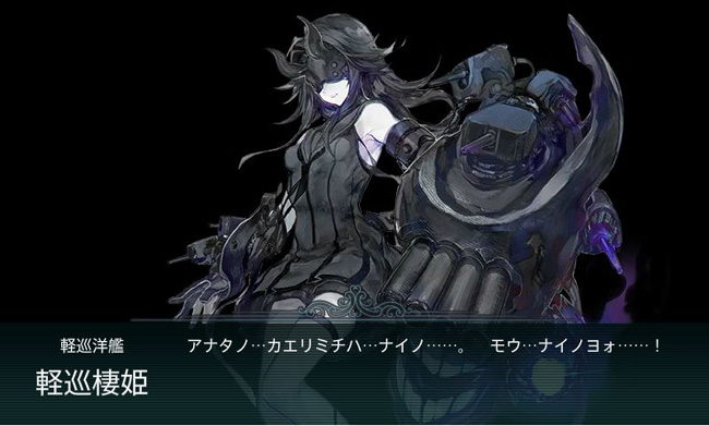 道中の2戦には夜戦マスもありますが、何とかこれを無事突破してボスマス到達。ボスは初登場となる軽巡棲姫・・・コロンバンガラ島沖海戦で沈んだ神通の闇堕ち化って感じの風貌ですね。