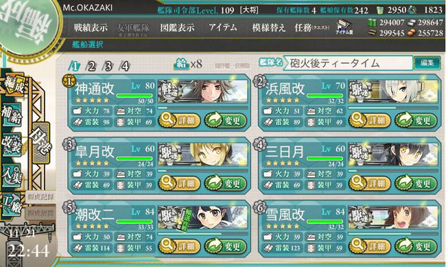 さて今回の編成ですが、事前情報により道中2戦で済む編成がある事を知りました。それは神通・雪風・浜風・皐月・三日月の「コロンバンガラ島沖海戦参加組」5隻と、それに自由枠で駆逐艦1隻を組み込む編成・・・。正直、皐月と三日月がかなりの足手まといですが(一応Lv.60とは言え)、輸送部隊としてドラム缶をこの2隻に集中的に配備して戦力として計算しない事にします。