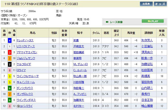 ノーマークだったサトノルパンに足下をすくわれる・・・。まぁこんな事もありますな。しかし武豊騎手はジャパンカップに乗る馬が無くて京都居残りとは、ちょっと寂しいですなぁ。