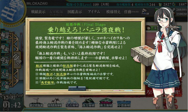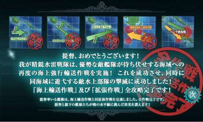 さて、最終海域は連合艦隊による総力戦!・・・と思いきや、戦艦も空母も潜水艦も出せない、地味ぃーな水雷戦隊による通常艦隊編成。イベント最終海域としてはちょっと盛り上がりに欠けますなぁ。