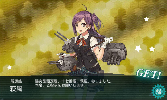 海域突破報酬、そして秋イベ完走報酬は駆逐艦萩風!CV:早見沙織の優等生キャラ!そのくせ下着は紫とか!たまんねぇなおいw