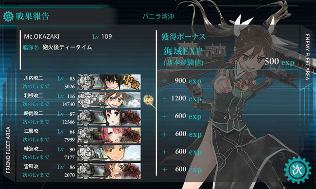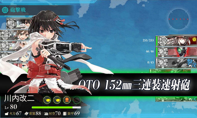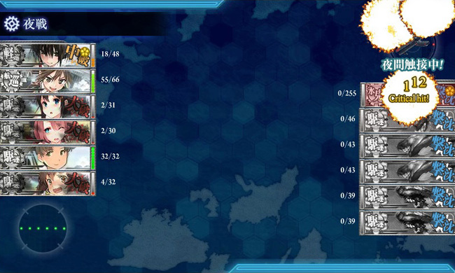 しかもこの海域、川内と時雨と江風を艦隊に組み込む事によって道中1戦減らせる事もあって、必然的に艦隊は「旗艦川内+駆逐艦時雨&江風、自由枠の駆逐艦2隻、他に巡洋艦クラスの随伴艦1隻」という編成になります。