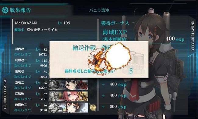 艦隊編成は固定艦3隻の他は、水爆による制空&火力要員の航巡利根、それと駆逐艦は輸送作戦時は耐久力の高い艦娘を選んでいます。まずは生き残って輸送を成功させるのが第一ですからね。