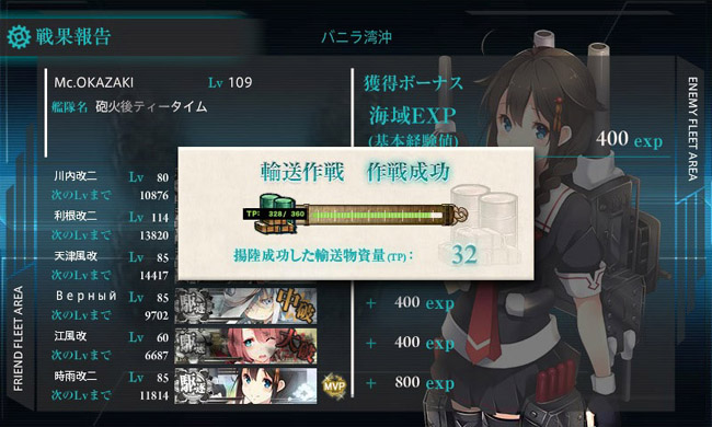 装備はドラム缶少なめ・火力高めにしたので1回に削れる輸送ゲージはこんなもん。これを10数回繰り返すので、輸送ゲージ破壊には2日間を掛けてじっくり行いました。