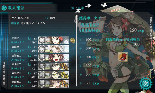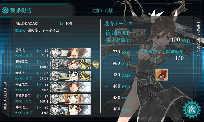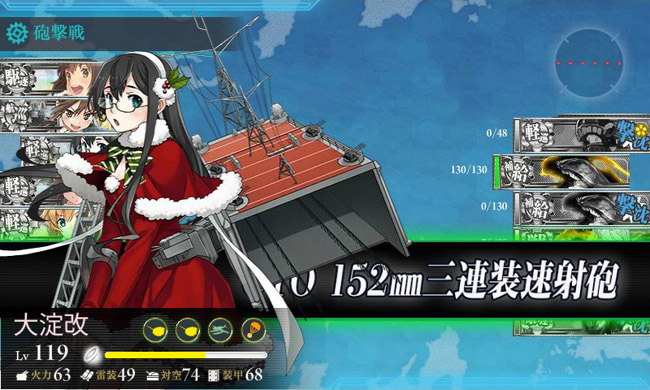 そして3-5は航巡1・軽巡3・駆逐艦2の準下ルート。早速クリスマスモードの大淀さんが北方海域で大活躍です。あぁ、もう可愛いなぁウチの嫁は!