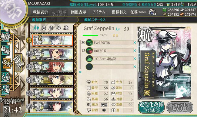 最後にグラーフ・ツェッペリン。実はこの艦娘の育成が一番大変でした。改装レベルが50と非常に高い上、20-13-10の艦載機スロットは中途半端でなかなか活躍してくれません。それでも演習と3-2-1で地道にレベリングを行って、何とか改装に成功しています。