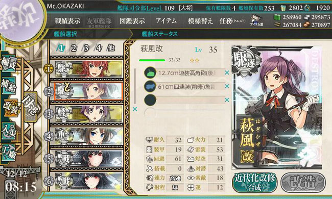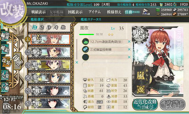 改装レベルは35。持って来る装備は12.7cm連装高角砲(後期型)と四連装酸素魚雷・・・レアと言えばレアですが、余剰気味の装備でもあります。