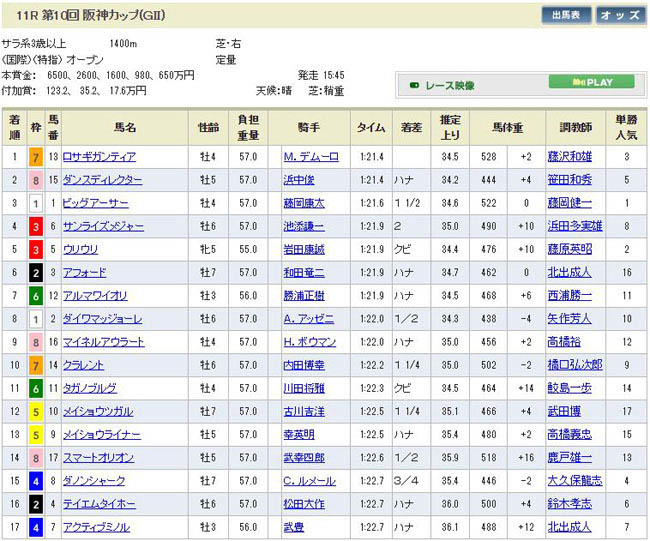 1番人気で今回重賞初制覇が掛かっていたビッグアーサーは3着まで。調教師の藤岡健一は、(息子の)藤岡康太騎手を負けたらこの馬から下ろすような事を言っていたそうですが・・・。兄の藤岡佑介は8月の落馬事故から未だに復帰出来ずにいますし、誰を乗せる事になりますかね?