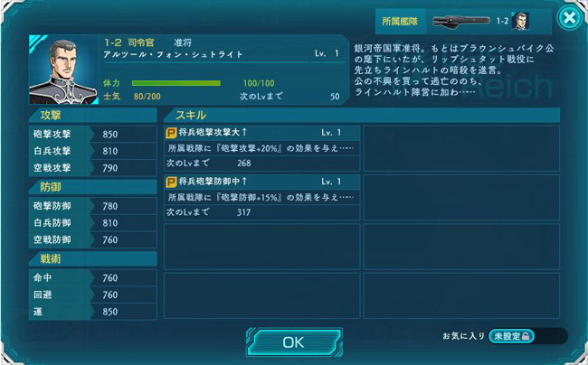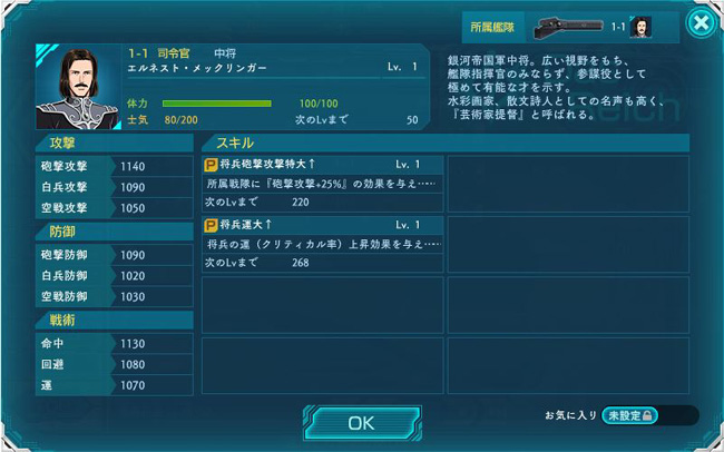 初期配備の提督が3人いるんですが、これってランダムなんですかね・・・? まずは3人の中で階級的に筆頭格のメックリンガー。芸術家提督の異名を持つ文人提督で、戦死者が続出したラインハルト揮下の提督の中で無事に最後まで生存した七元帥の1人でもあります。