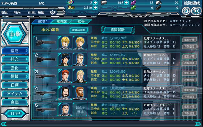 建造で高速戦艦(黒色槍騎兵艦隊仕様)と巡航艦を入手し、9人の士官はこのように配置しました。やっぱラインハルトの副官はヒルダですよね(勿論シュトライトでも良いのですが)。あとは何となく性格が合いそうな面子で・・・ミスターレンネンは扱いが難しいですw