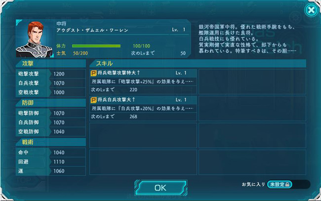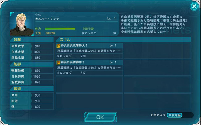 中佐待遇とは言え正確には軍人ではないので、能力はちょっと渋め。しかし特殊能力として「砲撃防御+25%」を持っているので、実戦では意外と役立つのかも。
