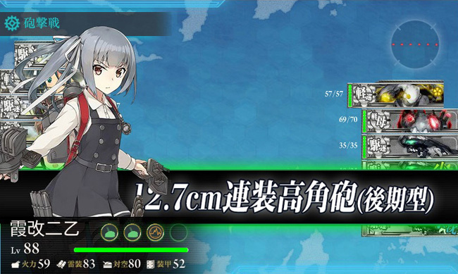 さて、ほぼ攻略編成が固定されつつある3-5ですが、今月は変化球で軽巡枠の1隻を甲標的満載の水上機母艦瑞穂に替えてお試し。航巡1・軽巡2・水母1・駆逐2の準下ルートです。