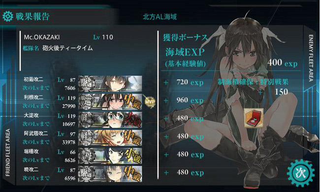 結果、ルート逸れなし・道中大破撤退1回とまずまずの安定度。この編成もアリだな、と。上手く行けば航巡の艦載機攻撃で1隻、阿武隈と水上機母艦の開幕雷撃で2隻と、砲撃戦前に3隻削れる事もある上、雷巡入り編成と違って2回に1回くらいの割合で道中2戦ルートにもなります。来月もこの編成かな?