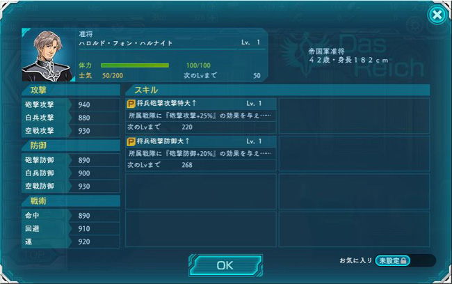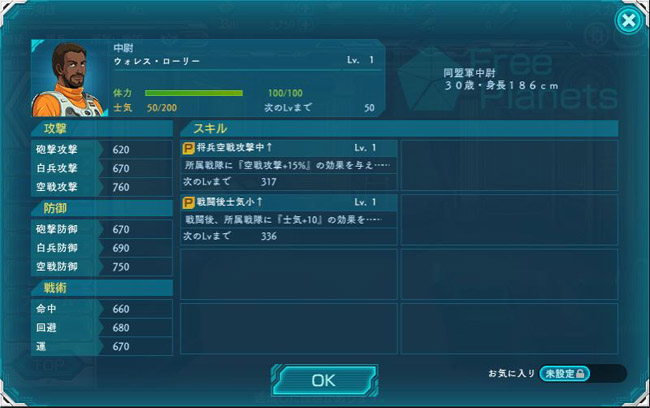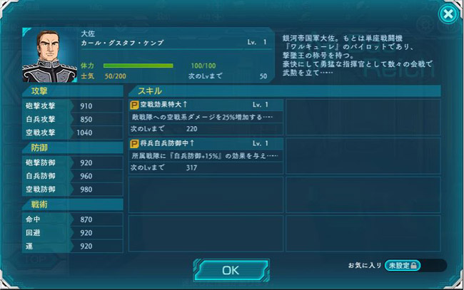 スパルタニアン乗りの癖に空戦能力はあんまり高くないですね。それ以外の数値はお察し・・・。今は人材がいないので適当に副官任務に就けておきますか。