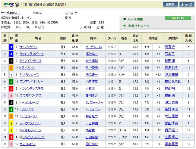 人気で切ったのがヤマカツエース(距離どうよ?と言うのと、今日の京都の馬場は内が最悪なので)と、タッチングスピーチ(繊細な牝馬にこの馬場は・・・。あと、負傷休養明けの福永騎手がここまで全然乗れていないので)ですね。穴は同レース昨年2着なのに9番人気のスズカデヴィアス辺りですかね。