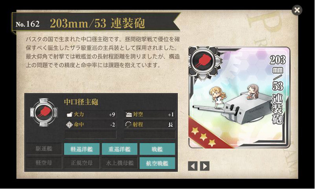 スペックはこんな感じ・・・命中−2を見て「使えねー!」と最初は思いましたが、射程:長に注目。搭載艦の攻撃順番を上げる事が出来るので、活用次第では軽巡・雷巡でも早い段階で攻撃してくれるようになります。