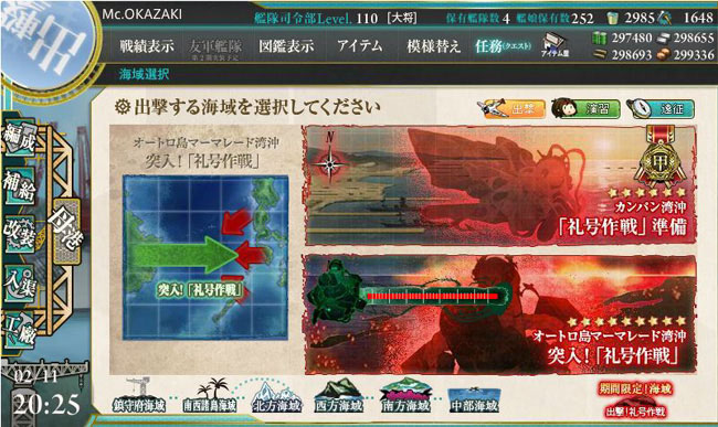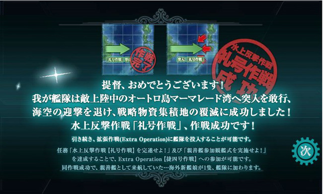 こうして礼号作戦は無事完遂。全く別方面の作戦となるE-3海域「捷四号作戦」への扉が・・・この段階では開きません。2つの任務を達成させた後に、最終海域への進軍が可能となります。ちっ、めんどいな(ぉぃ