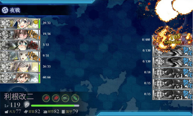 さて、問題のPTマスですが・・・あれれれ?なんか今回、こいつら凄く弱体化してる?鬼回避と魚雷カットイン攻撃に苦しめられた秋イベ時の面影がなくなり、重巡の主砲でもボコボコ当たりますし、攻撃力もかなり下がった感じ。これなら恐れるに足らず!この後、大淀はOTO副砲から15.2cm連装主砲へと装備を替えています。