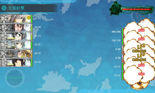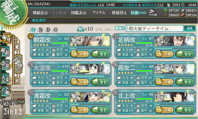 礼号作戦組が育ってる提督諸氏は、この航巡を加える編成が超お奨めですね。あと、霞の火力を活かすためにも対空カットイン装備は、対空値がそれなりに高い朝霜に持たせるのが良いみたいですね。